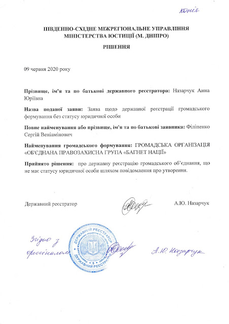 З 1-го червня 2024 року у зв’язку із перереєстрацією нашого офіційного видання відповідно до вимог Закону України від 13 грудня 2022 року № 2849-ІХ «Про медіа» та вимог Закону України від 23 вересня 1997 року № 540/97-ВР «Про державну підтримку медіа, гарантії професійної діяльності та соціальний захист журналіста», учасникам громадського об’єднання видаватимуться оновлені посвідчення громадського діяча Громадської організації «Об’єднана правозахисна група «Багнет Нації» (реєстрація шляхом повідомлення - РГО за № 1508568 від 01.06.2020 року), а також посвідчення журналіста-кореспондента благодійного видання друкованого засобу масової інформації (газети) «Багнет Нації» (Свідоцтво ДП № 2303-1041р від 29.03.2021 року, ідентифікатор медіа – R30-04367 – відповідно до рішення Національної ради з питань телебачення і радіомовлення № 1623 від 09.05.2024 Протокол № 15), зразки яких публікуються (нижче).